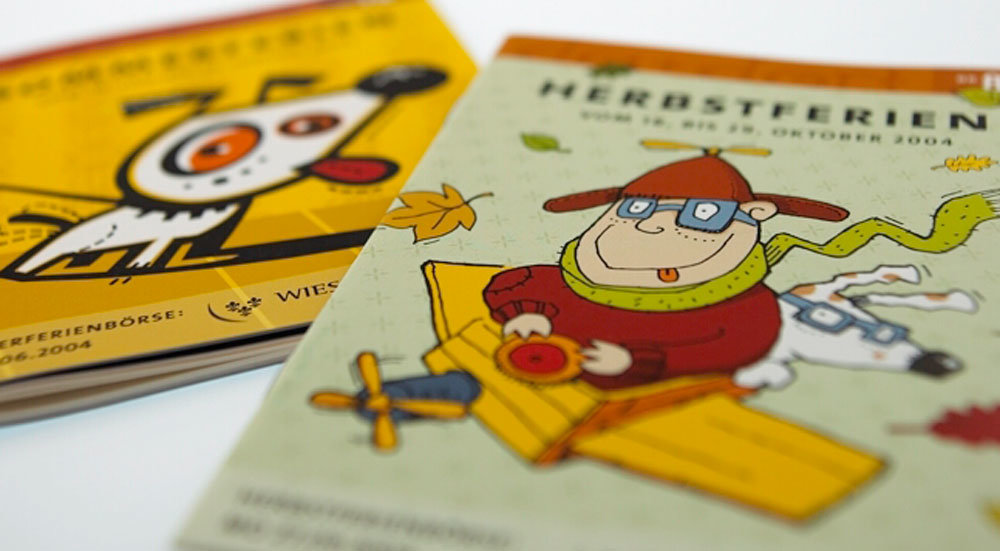 Wau! Unseren lustigen Hund kennt jedes Kind. Schließlich sind er und seine Freundin die illustrierten Protagonisten für das Ferienprogramm Da & Dort des Amts für soziale Arbeit Wiesbaden. Und, ob auf dem Cover oder bei den zahlreichen Angeboten in der hausaufgabenfreien Zeit, die Beiden machen Werbung für Freizeit ohne Langeweile. Das kommt gut an und bringt immer wieder volle Ferienlaune.