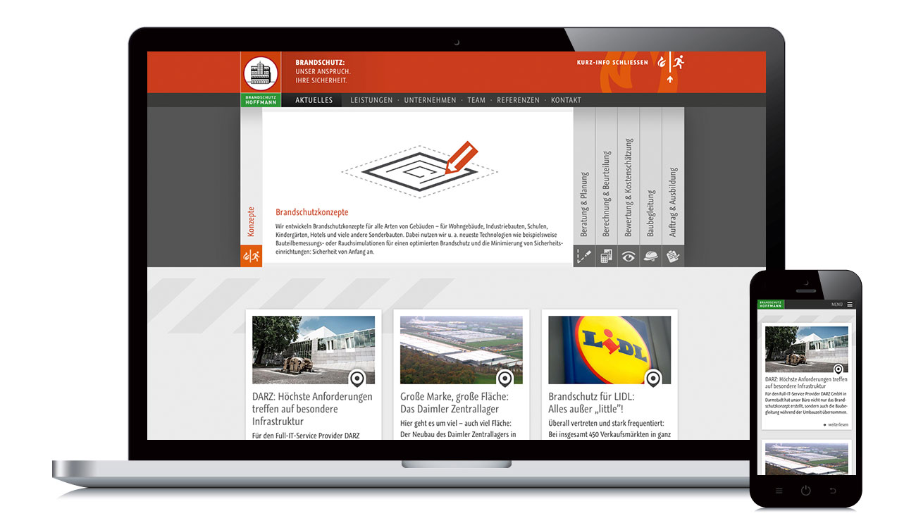 Unser Einsatz für den Offline- und Online-Auftritt des Brandschutz-Experten Hoffmann zeigt, dass uns kein Eisen zu heiß ist: Wir haben sowohl Flyer für verschiedene Zielgruppen im B2B-Bereich gestaltet als auch die Internet-Präsenz neu aufgebaut. Das Ergebnis: Ein klares Erscheinungsbild, das ohne Umschweife über die Kompetenzen des Unternehmens informiert und auf entsprechende Referenzen verweist. Genau darauf kommt es ja auch an, wenn man sich, Zeit, Nerven oder Tatütata ersparen will.