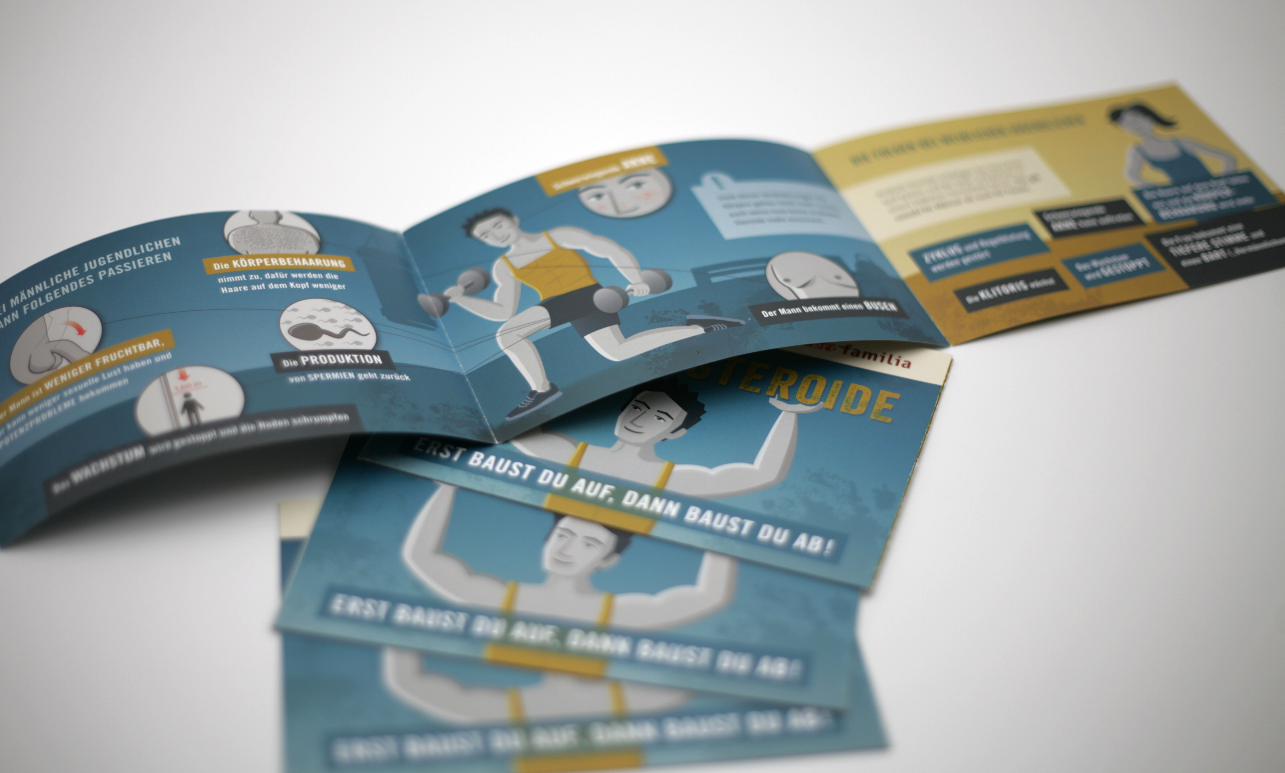 Muskeln sind klasse. Sie aufzubauen macht Spaß. Was aber, wenn man mit Boostern nachhilft? Diese 99° Broschüre, die wir für pro familia entwickelt haben, klärt Jugendliche über Anabole Steroide auf, um vom Doping abzuhalten. Mit schöner Illustration gegen böse Frustration.