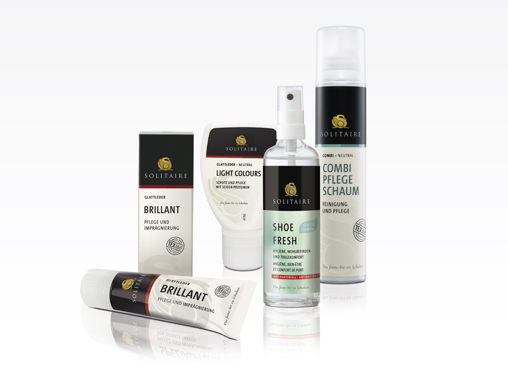 Jeder Schuh will gepflegt sein. Und für diese Pflege sorgen wir, denn unsere Packaging Range für Solitaire hat vermutlich jeder schon einmal in der Hand gehabt. Als Marke mit dem goldenen Schwan steht Solitaire für wertige und funktionale Schuhpflege. Genau das, worüber sich ein Schuh so freut.