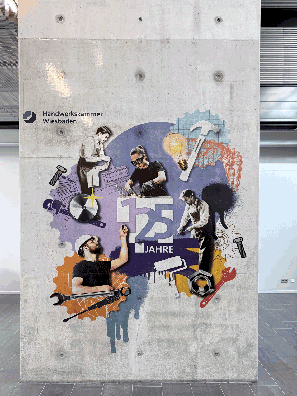 Diese Illustration ist nicht nur als riesige Wandgestaltung zum Leben erwacht, sondern ist auch an der Jubiläumsfeier live vor Ort an die Wand gedruckt worden. Um historisches Handwerk und moderne Techniken zu vereinen, haben wir eine Collagenoptik gewählt. Verschiedenste Stile und Personen arbeiten zusammen, in deren Zentrum das Jubiläumslogo glänzen kann. Der Schichtbeton sollte hierbei bewusst in Szene gesetzt werden.